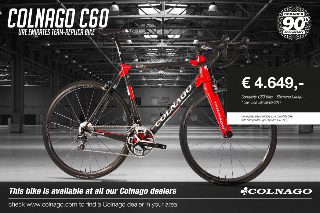 Codagex bestaat dit jaar 90 jaar en dat vieren we graag met deze Colnago C60 UAE Emirates Team-Replica fiets voor een feestelijke prijs.